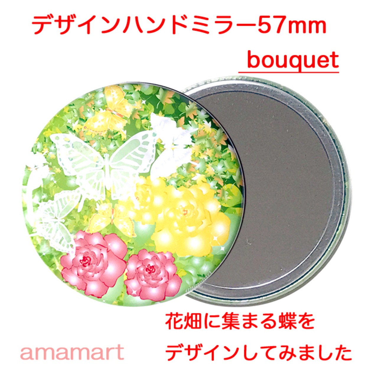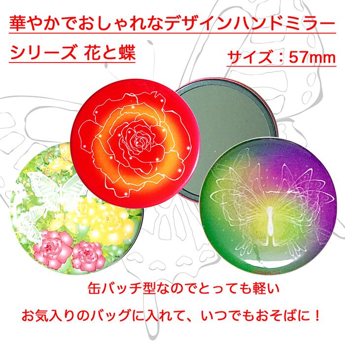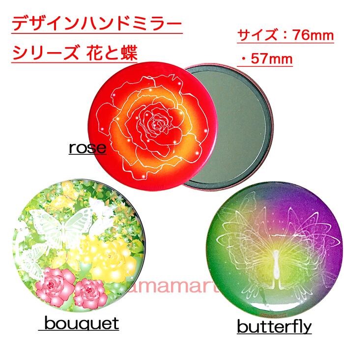 バラ 蝶 花束 オリジナルデザイン ハンドミラー 直径57mm 華やか で おしゃれな 鏡 ! | amamart (アムアムアート) オンリーワン アートTシャツ オリジナルデザイン 手作りアクセサリー の通販サイト