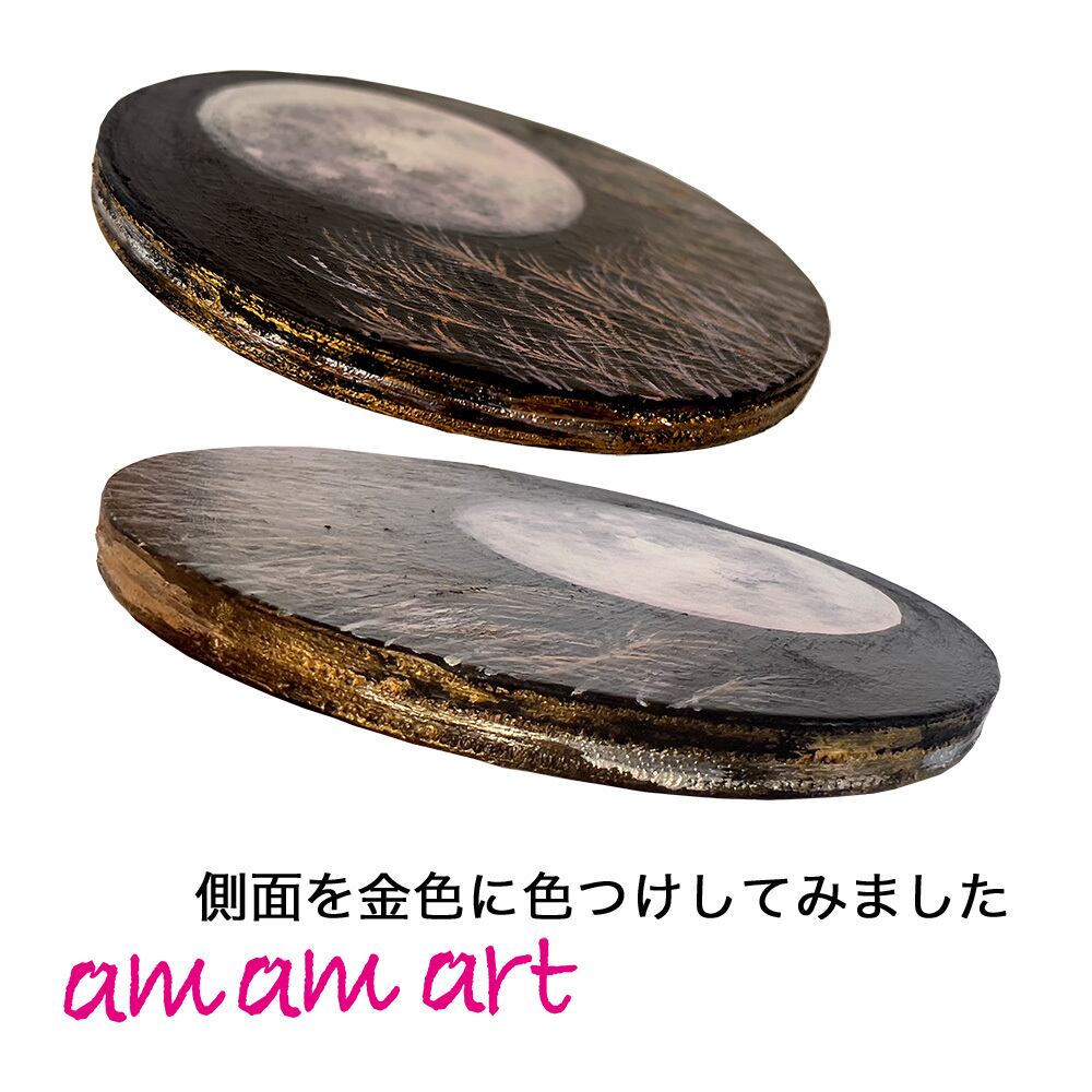 こちらの作品は、厚みのある、かわいい 丸い木 を キャンバス に