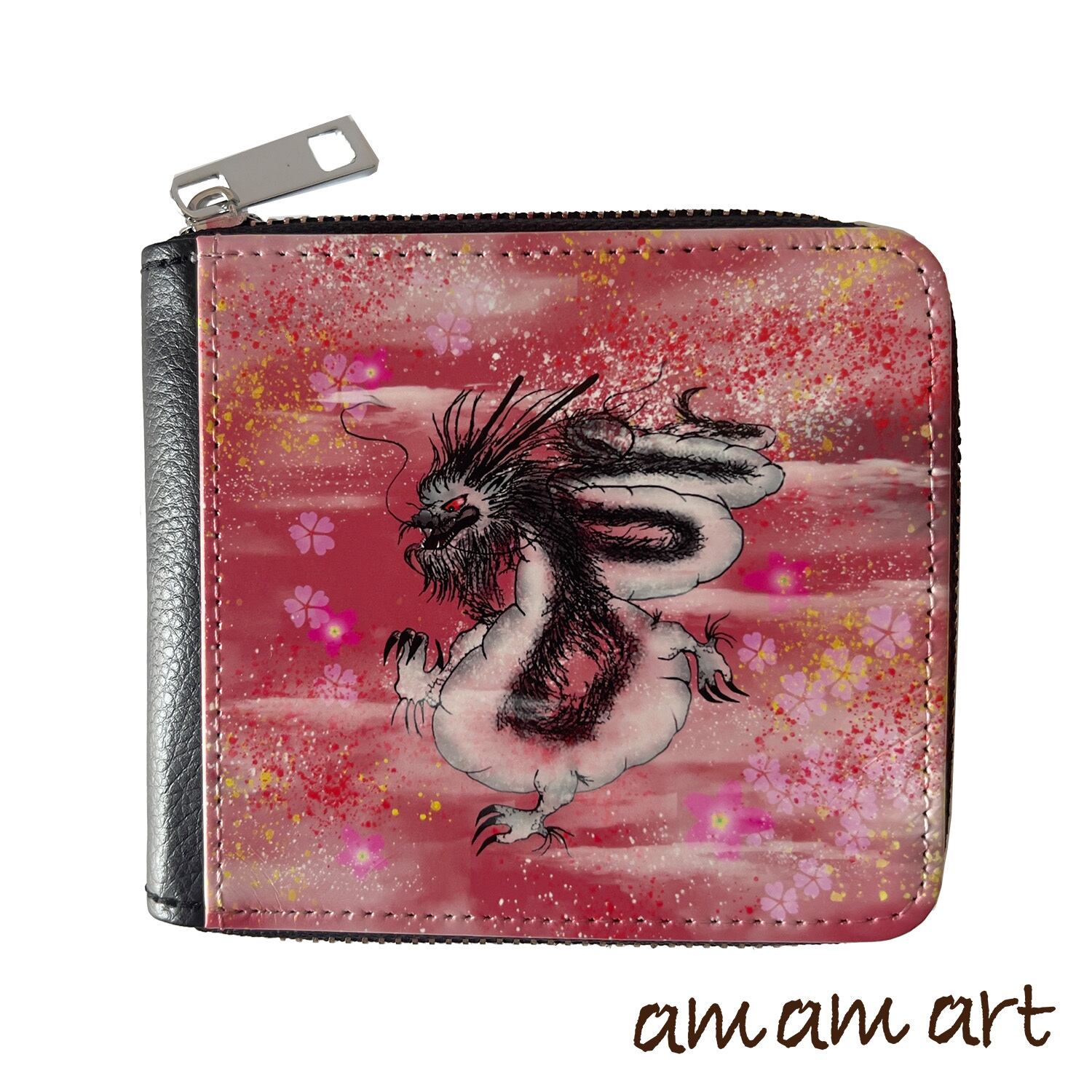 「 白龍 と 桜 赤雲 」 二つ折りタイプ の 財布 ファスナー タイプ 龍 オリジナルデザイン ファスナーがある二つ折り財布 | amamart (アムアムアート) オンリーワン アートTシャツ オリジナルデザイン 手作りアクセサリー の通販サイト