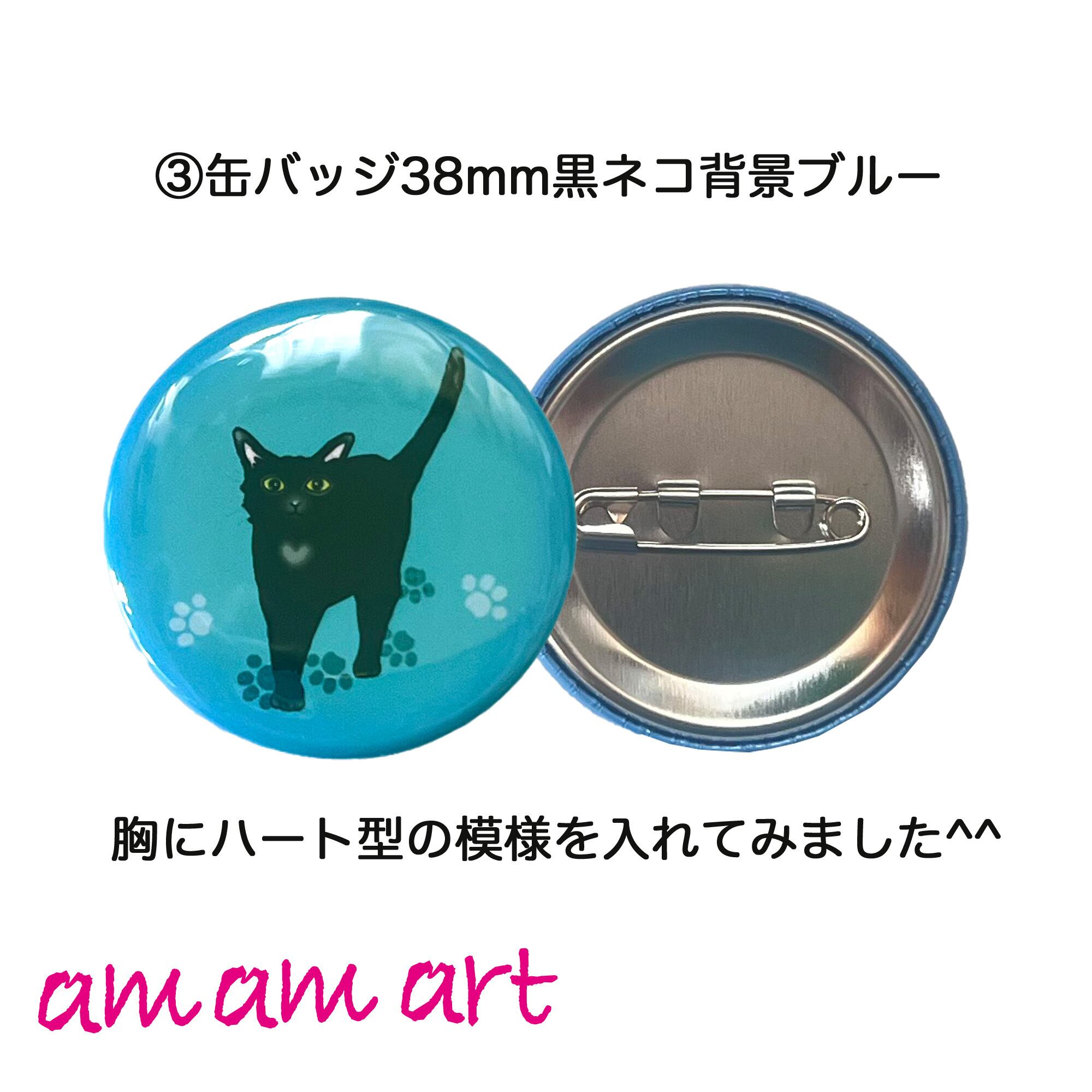 ③. 缶バッジ38mm 黒ネコ背景ブルー