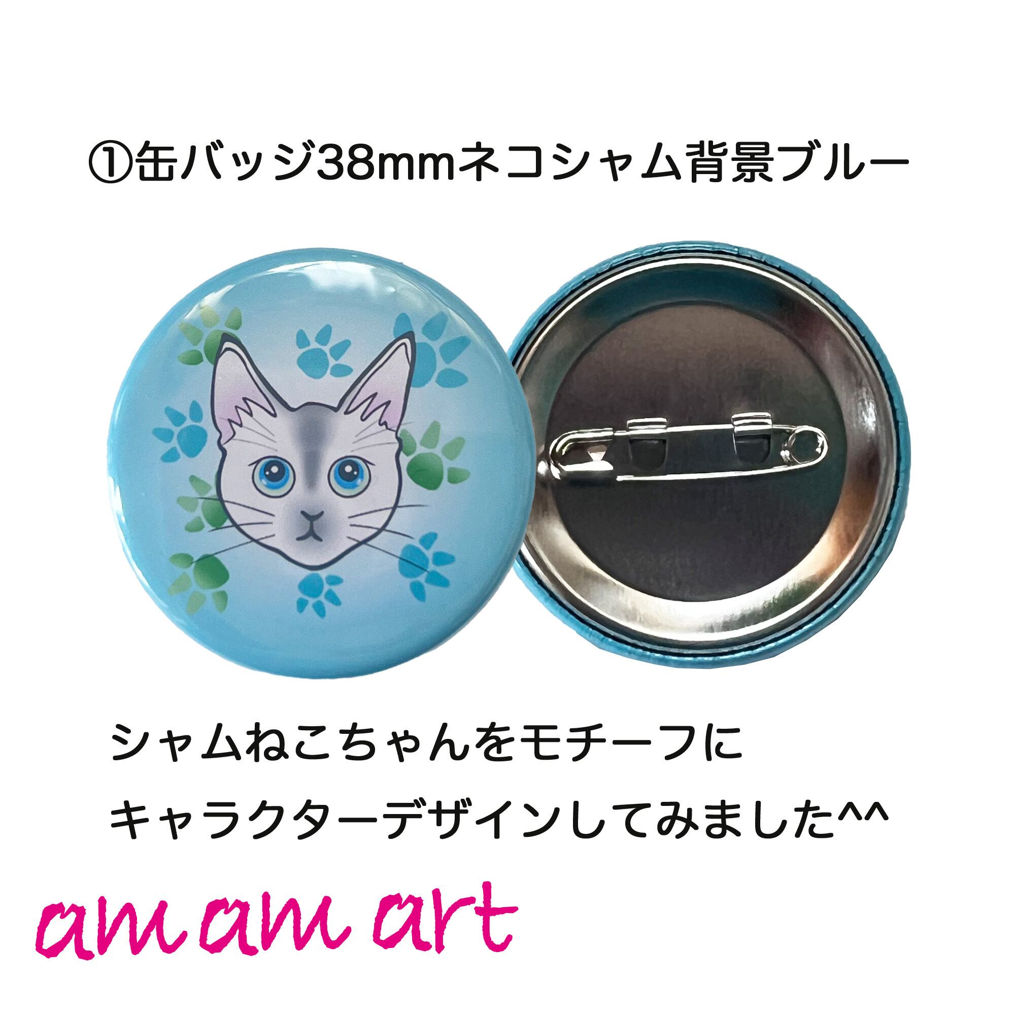 ● 1. 缶バッジ38mmネコシャム背景ブルー